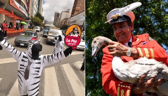 В Боливии, как и во всех странах, существует дорожная разметка, обозначающая пешеходный переход. Но интересно, что там есть и живые дорожные зебры. Их роль играют люди, следящие за безопасностью движения. Они наряжены в костюмы зебры. Кроме того, «лошадки» информирую граждан о том, как важно соблюдение правил дорожного движения. Полосатики оказывают помощь пешеходам при переходе дороги, выполняют роль регулировщиков, занимаются раздачей информационных листовок. Особо наглые нарушители, например те, которые останавливаются на пешеходных переходах, могут получить полосатый подарок, в виде лежащего на капоте активиста.