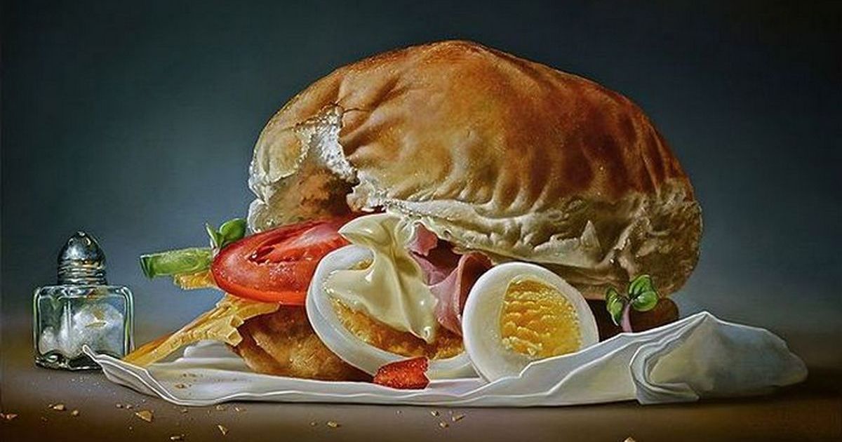 Это не фото... это одна из суперреалистичных картин Тома Мартина на тематику еды. Мартин - английский художник, который утверждает, что получает вдохновение на создание его картин в повседневной жизни. На самом деле, он явно любит поесть, поскольку большая часть его картин связана с едой, и только одна - c девушкой.