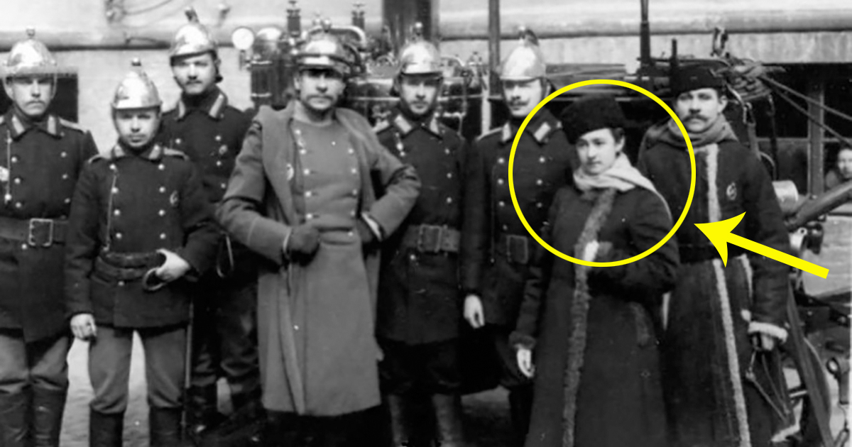 Пожарный расчёт Александро-Невской пожарной части Санкт-Петербургской Пожарной Команды. Среди профессиональных пожарных первая женщина-пожарный России Мария Алексеевна Ермолова. 1910 г./Фото: img-fotki.yandex.ru