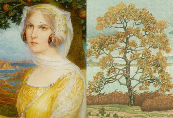 Артурианский цикл завораживал и британскую «коллегу» Сонрель – одну из поздних последовательниц прерафаэлитов, акварелистку Элеанор Фортескью-Брикдейл. Прекрасная неверная жена короля Артура в роскошных одеждах и расцвете свой красоты замерла, словно увидев или услышав что-то, под яблоней, чьи ветви клонятся под тяжестью плодов.