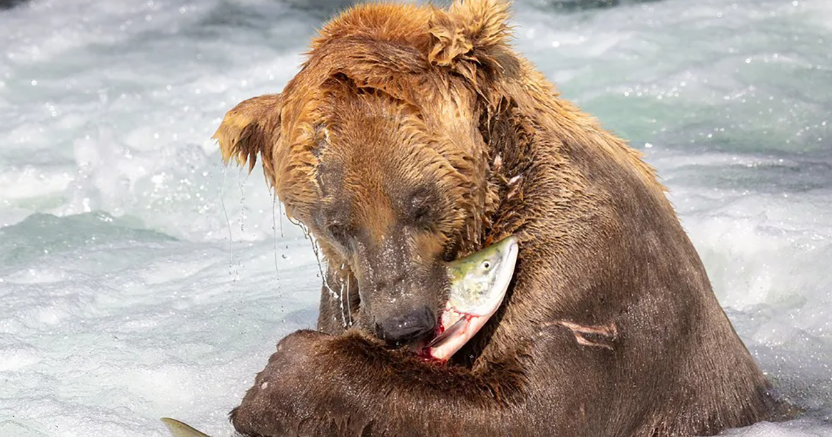 Отис, справа, охотится на лосося в своём любимом месте для рыбалки, известном как его «офис», недалеко от водопадов Брукс в национальном парке и заповеднике Катмай на Аляске в августе 2022 года. / Фото: smithsonianmag.com