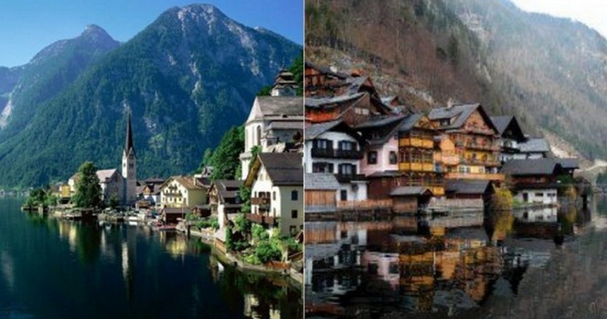 Справа австрийская деревня Гальштат, слева - китайская копия