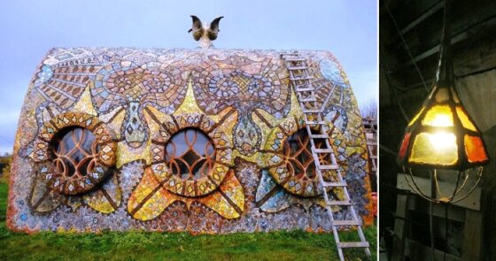 Внутри дома, помимо необычных светильников, можно увидеть уникальный камин, наружный дымоход которого, кстати, выполнен в форме ангела, необычные кресла из фрагментов ванны, крутую фантазийную лестницу, уникального вида кухню.