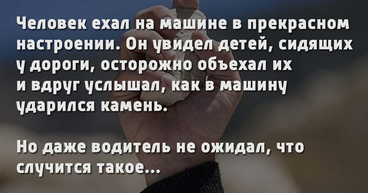 Ехал один молодой человек на новом сверкающем «ягуаре» в прекрасном настроении, напевая какую-то мелодию. Вдруг увидел он детей, сидящих у дороги. После того, как он, осторожно объехав их, собрался снова набирать скорость, он вдруг услышал, как в машину ударился камень.