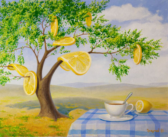 На последних картинах русского художника-сюрреалиста Виталия Уржумова явно прослеживается "лимонная тема". Желтые спелые лимоны, разрезанные на дольки, свисают с веток деревьев, "цветут" на полях и украшают букеты в вазах, превращаясь в изысканные необычные цветы.