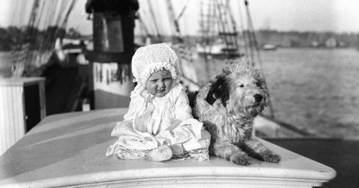 Ребенок и собака на парусном судне, 1910 год.