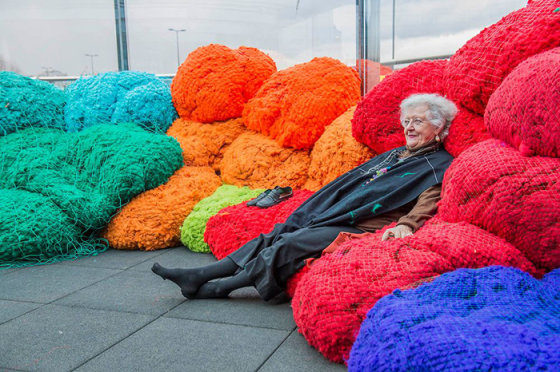 Шейла Хикс позирует с одной из своих работ. Инсталляция из нитей.