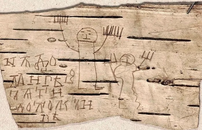 Нашлось сразу несколько грамот одного мальчика по имени Онфим, который не только старательно упражнялся в правописании, но и, видимо, когда ему надоедало, делал зарисовки.