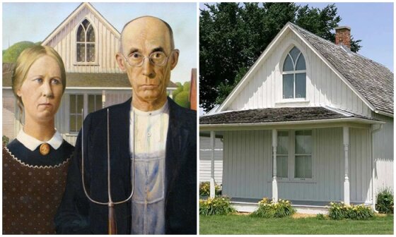 Слева направо: Американская готика, Грант Вуд, 1930 год, Чикагский художественный институт. \ Настоящий дом в Элдоне, штат Айова, который вдохновил на создание картины, по историческому каналу.