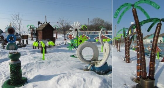 А начиналось все с пальм: как-то пенсионер соединил несколько пластиковых бутылок, потом ещё несколько, раскрасил, «высадил» на участке – и получилось очень похоже. Повсюду снег, а у дяди Коли – тропики. Следом за пальмами участок заполнился пластиковыми лебедями, персонажами из сказок, появилась симпатичная мельница. Помимо пластика, рукодельник использует и дерево, и металл.