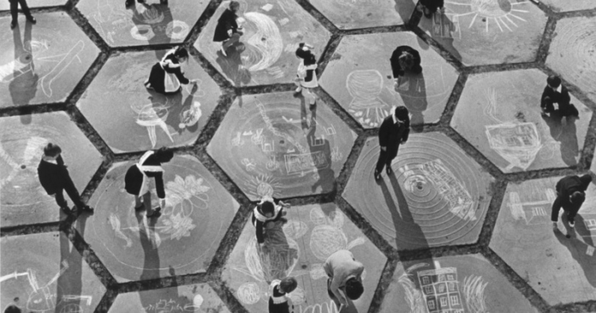 Дети рисуют мелом на плитах. СССР, Москва, 1960 год. Фотограф: Анатолий Хрупов.