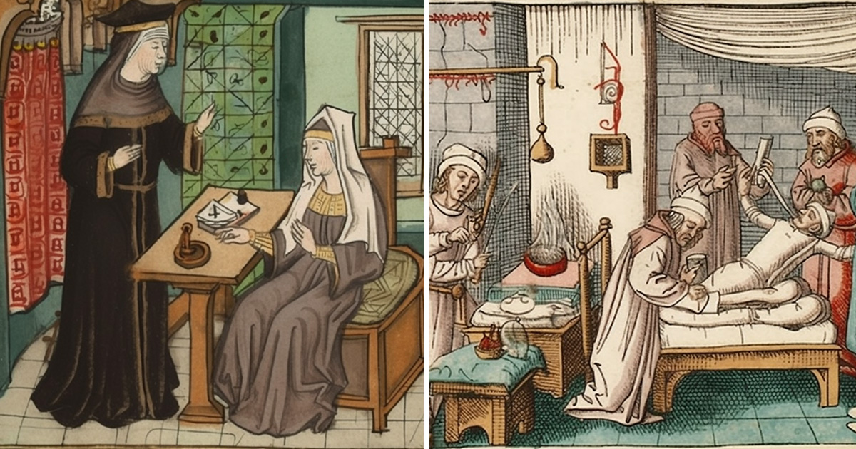 Карл VI, прикованный к постели, и его врач, в хрониках Фруассара, около 1300-х годов. \ Фото: wordpress.com.