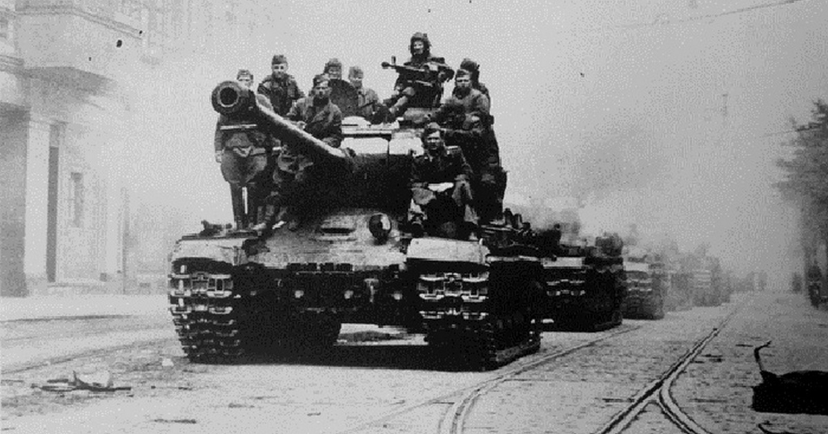 Групповой снимок красноармейцев на тяжелом танке ИС-2 на улице Берлина.