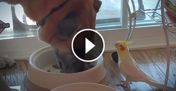 Обед под живую музыку: попугай поет серенады псу, пока тот ест