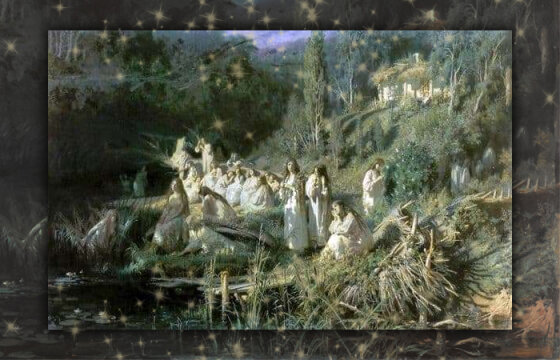 Ночь, темное время суток. Героини ярко и контрастно выделяются на фоне темной ночи. Это 19 русалок, которые, согласно славянской мифологии, были речными или озерными духами. Они появлялись ночью в образе молодых женщин. Некоторые мифы описывают русалок как духов, которые умерли некрещеными или незамужними, и утонули в результате безответной любви. Ночью духи русалок выходили из воды, чтобы петь и танцевать. В европейской культуре есть аналог славянским мифам о русалках – это сирены, которые очаровывали молодых людей, прежде чем заманить их на самое дно реки.