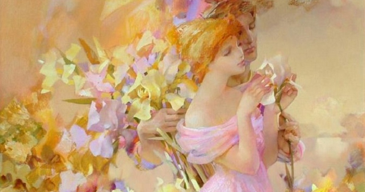 Фантастические цветы и влюблённые парочки на нежных картинах художника- романтика Евгения Кузнецова