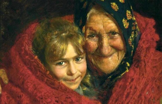 И если милые детские лица всегда наполняли картины художника светом и радостью, то пожилые - мудростью и душевной добротой. Хотя старость — она и есть старость. Художник не скупился в реалистичности деталей, изображая старух с морщинистыми лицами и скрюченными тяжелым трудом руками. И как контраст - милые румяные лица детишек, которые искренне тянуться к старушкам, демонстрируя свою искреннюю любовь и привязанность.