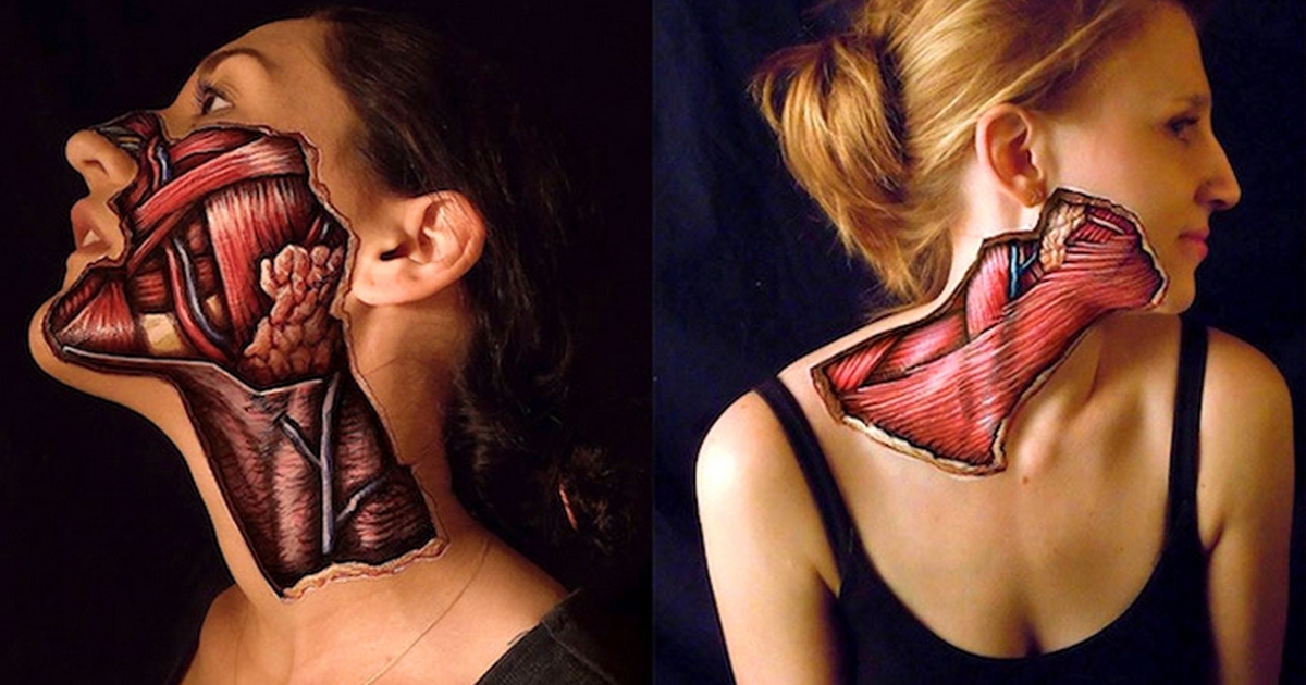 Художник Дэнни Квирк (Danny Quirk) удивил публику своими анатомическими иллюстрациями, нанесенными прямо на человеческое тело. С помощью специальных маркеров и акриловых красок он будто срывает кожный покров и выставляет напоказ мышцы, связки и кости. С одной стороны, это выглядит немного жутко, а с другой - невероятно интересно!