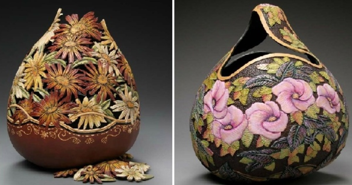 Хитросплетением листьев, цветов и ягод, фигурками фантастических рыбок, птичек и бабочек покрывает американская художница Мэрилин Сандерлэнд свои тыквенные скульптуры, превращая обычный овощ, выращенный на грядке, в шедевр. Эти удивительные резные экспонаты несомненно являются произведениями искусства, они восхищают и заставляют восторгаться зрителей тонкой кропотливой ручной работой мастерицы.