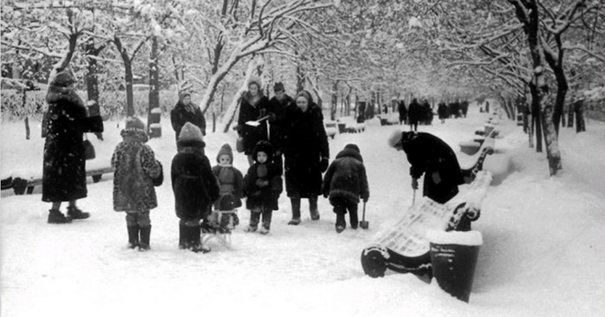 Посиделки зимой на скамейке на театральном проезде в 1950-х годах.