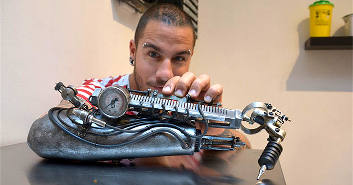 Для французского мастера тату фраза "работа - неотъемлемая часть моей жизни" - это не пустые слова. Вместо правой руки и него уникальный протез, который является одновременно тату-машинкой, так что на время работы мастер буквально становится с ней одним целым.