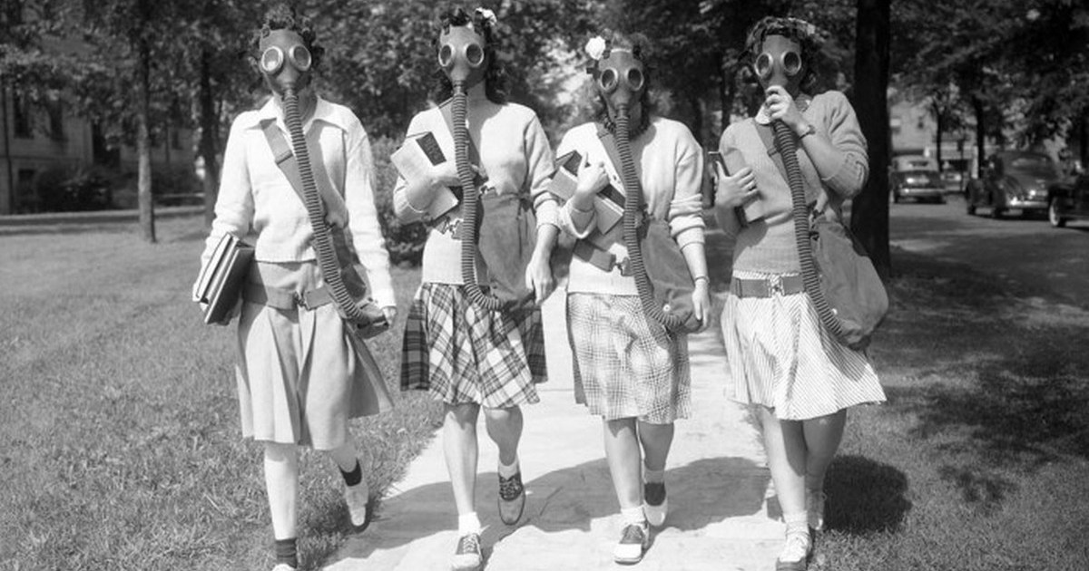 Студентки из университета Детройта испытывают противогазы на практике. Студенческий городок, 23 июня 1942 года.