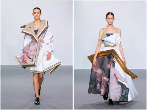 Для модных метаморфоз Виктор и Рольф выбрали полотна, принадлежащие к времени Золотого века голландской живописи. Именно тогда создавались всемирно признанные шедевры Рембрандта, Вермеера и Яна ван Эйка. Изысканные натюрморты, сочные сцены повседневной жизни, нежные портреты - все это было перенесено на мягкие ткани платьев, окаймленные "золотистой рамкой", из-за чего наряды создали эффект ожившей архитектуры, как бы странно это ни звучало. Диссонанс между "поломанной рамкой" и мягкими волнами тканей с шедеврами живописи по задумке авторов создают ощущение драмы и резонанса.