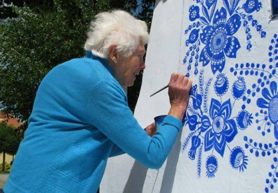 Эта 87-летняя бабушка - настоящий пример жизнелюбия и старания. Каждый день старушка пытается сделать мир чуточку лучше и красивее. Она расписывает фасады домов традиционными цветочными орнаментами. Дрожащие руки, боль в ногах и пояснице не могут заставить ее отказаться от любимого дела.