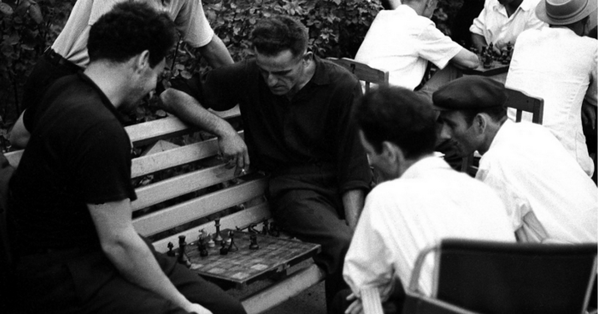Выигранная партия на лавочке в центральном парке культуры и отдыха имени Горького. СССР, Москва, 1963 год.