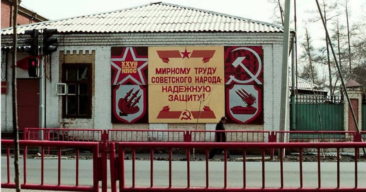 Агитационный плакат на одном из зданий. СССР, Иркутск, 1988 год.