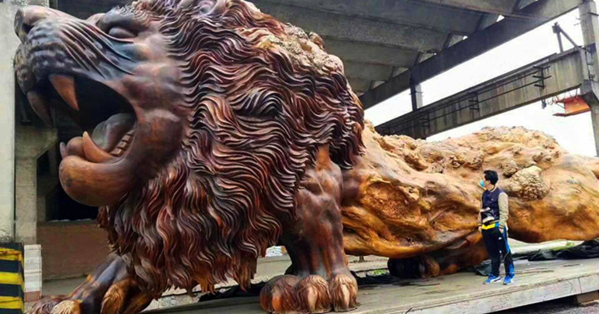 Совсем недавно на площади Fortune Plaza Times в Ухане, столице китайской провинции Хубэй, была установлена огромнейшая статуя льва. Самое примечательное в этой скульптуре, что она сделана из цельного дерева: длина льва составляет 14,5 метров, высота 5 метров, а ширина 4 метра, а каждая деталь этого грандиозного животного некогда была одним стволом дерева.