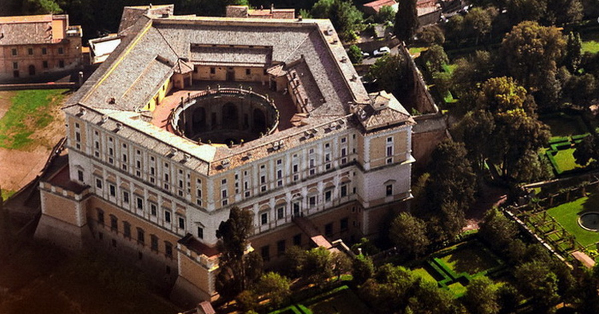 Вилла Фарнезе, или замок Капрарола, находится в пятидесяти километрах к северо-западу от Рима, в регионе Лацио. Ее начали возводить в двадцатые годы XVI века по поручению кардинала Алессандро Фарнезе, будущего Папы Римского Павла III. Однако при его жизни строительство завершено не было, и резиденцией позже занялся внук Павла III, тоже носящий имя кардинала Алессандро Фарнезе.