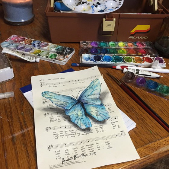 Художница Жанет Роуз (@JanetteRose) - натура утонченная и романтичная. Она создает удивительные миниатюры, используя в качестве холстов нотные листы и опавшие листья. Поверх нотного стана рисует утонченных бабочек, которые, кажется, вот-вот взмахнут крыльями и упорхнут в цветочные дали, а на крошечных кленовых листьях вдруг оживает целый мир дикой лесной природы.