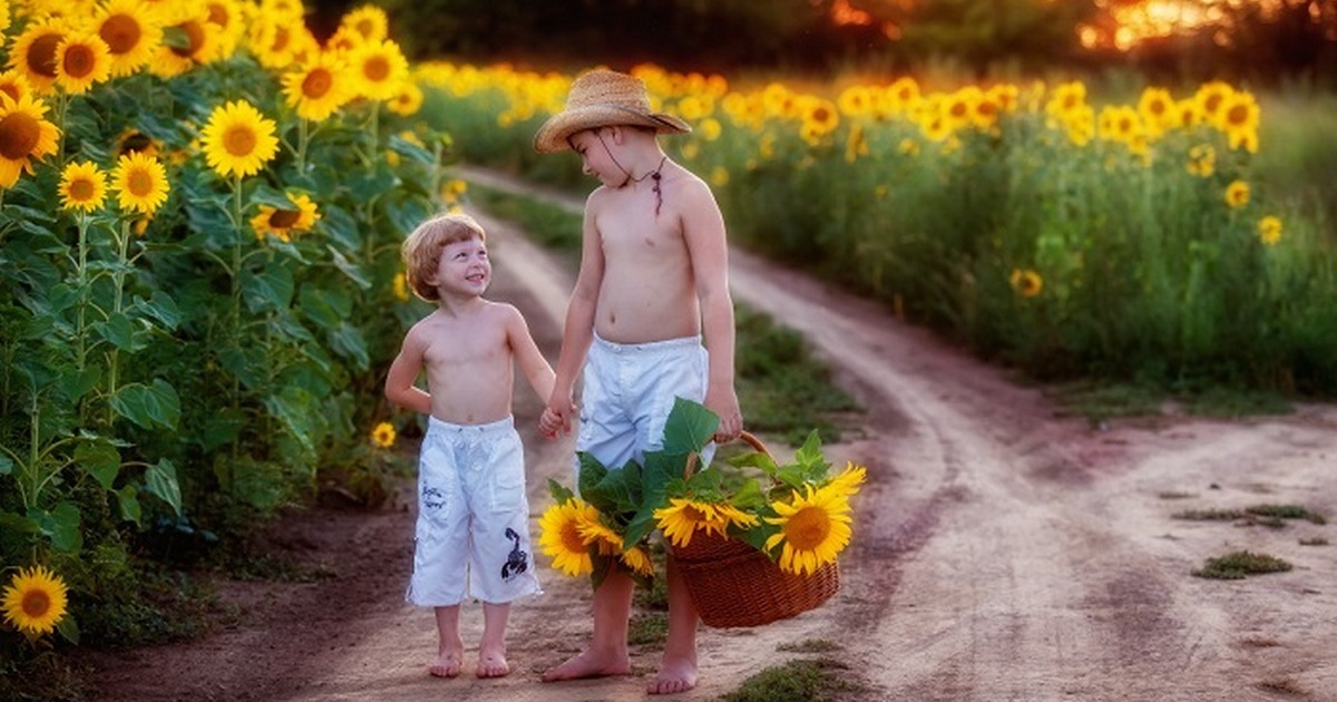 Два брата идут вдоль проселочной дороги, по краям которой растут желтые подсолнухи. Автор фотографии: Екатерина Савёлова.