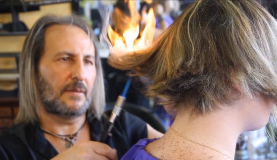 Клиентка откидывает голову назад, а Альберто начинает работать двумя мечами одновременно, чтобы стрижка с обеих сторон одинаковая. Избавляться от посеченных кончиков он предлагает при помощи паяльной лампы при температуре пламени в 1300 C. Довершает образ испанец, используя стальные когти, которыми он придает прическе дополнительный объем.