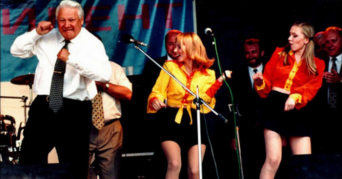 Борис Ельцин танцует на концерте во время своей избирательной кампании, 1997 год