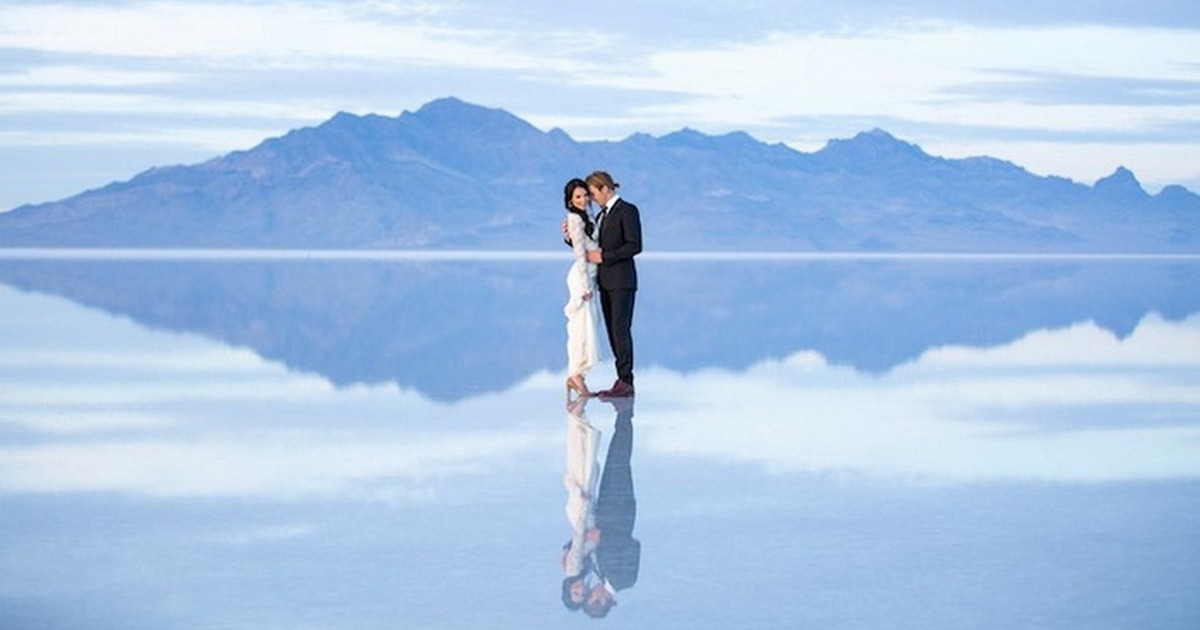Невероятно, но фотограф Тони Гамбино (Tony Gambino) не использовал фотошоп. Удивительные кадры были действительно сделаны на лоне природы. Торжественная церемония бракосочетания состоялась в Солт-Лейк-Сити, а вот фотографироваться пара захотела на пересохшем соляном озере Бонневилль Солт Флэтс. Приехав туда, и фотограф, и молодожены с восторгом обнаружили, что огромный белоснежный соляной «океан» превратился в громадное зеркало, создав иллюзию отражения.