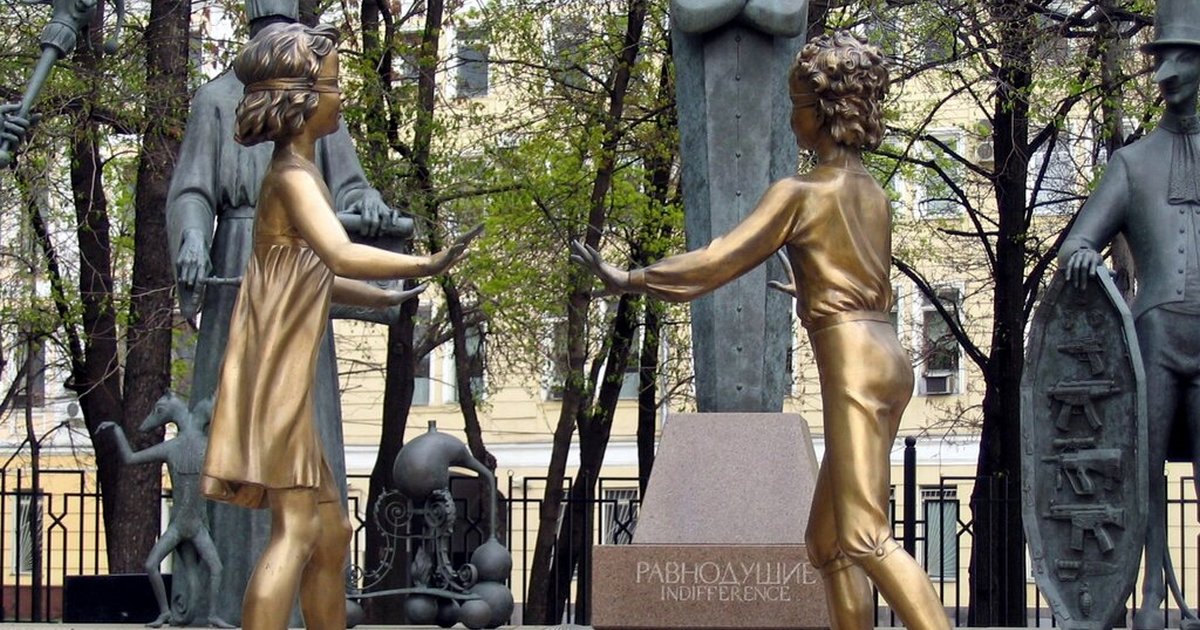 В центре композиции расположены девочка и мальчик, которые играют мяч, но глаза их завязаны. Вокруг них находятся большие серые фигуры, которые олицетворяют всевозможные соблазны и пороки взрослого возраста: алкоголизм, наркоманию, нищету, безразличие. Дети не замечают этого, но пороки тянут к ним свои руки. Так происходит и в жизни, чтобы решить проблему, нужно сначала ее увидеть, узнать, понять, а не убегать. Нужно снять эту повязку с глаз и взглянуть страхам в лицо. Очень глубокий и сильный памятник, на котором стоит задержать свой взгляд.