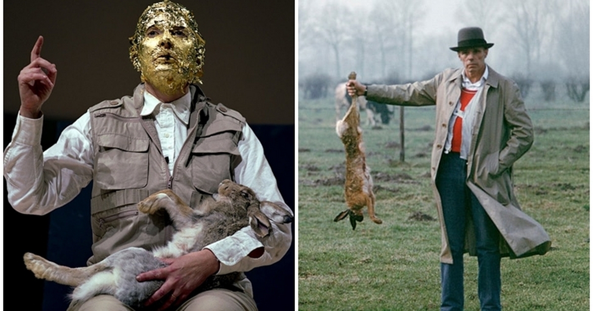 Слева направо: Как объяснить картинки мертвому зайцу, Джозеф Бойс, 1965 год. \ Двор, Аллан Капроу.