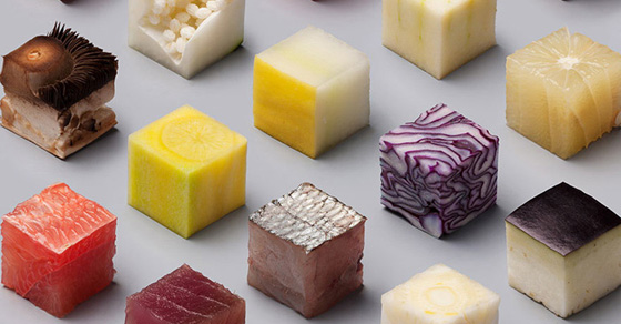 Голландские художники Лернерт и Сандер вырезали из сырых продуктов 98 кубиков идеальной формы 2,5 х 2,5 х 2,5см, создав таким образом выставку, от которой буквально слюнки текут. Это двойное наслаждение: инсталляция даже заочно радует вкусовые рецепторы, предвкушая вкусную еду, а идеальная форма продуктов порадует настоящих перфекционистов.