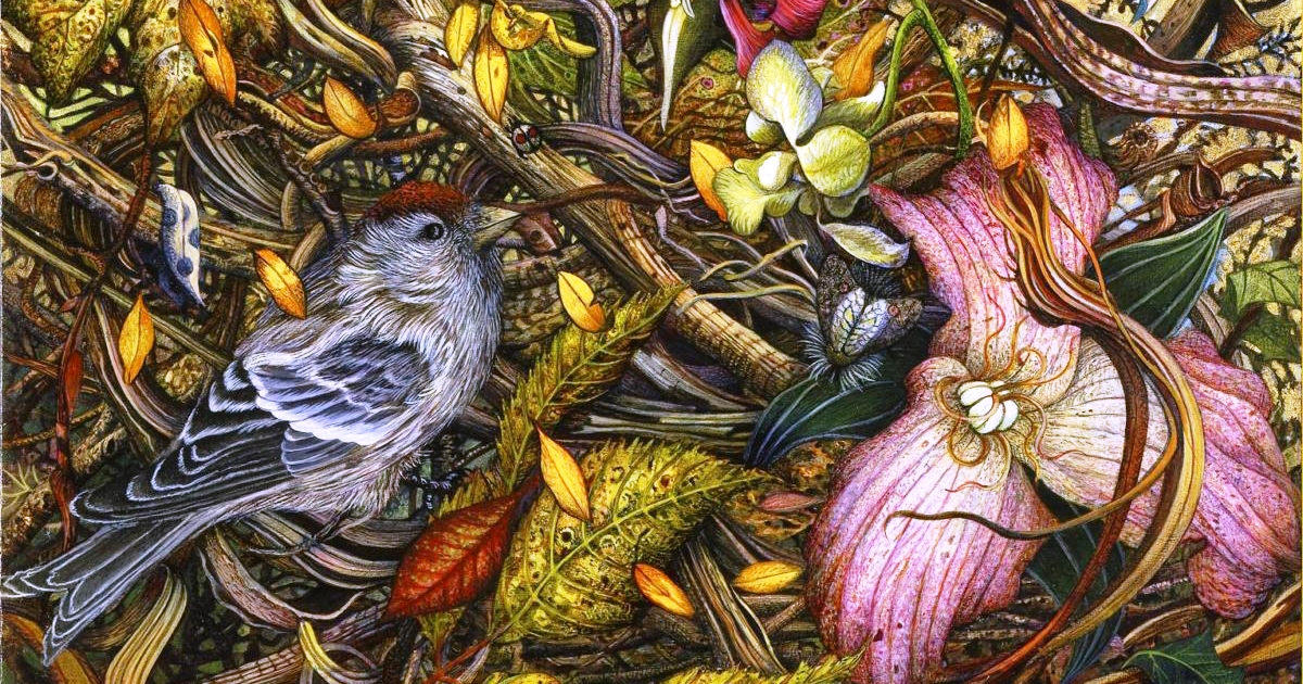 Витиеватые узоры растений, чьи стебли и листья сплетаясь между собой, тянутся к пёстрым птицам, сидящим на ветках. Яркие цвета, сочные оттенки, абстрактные формы и богатые растительные мотивы оживают в работах современного художника Джуди Гарфин (Judy Garfin) известной во всём мире своими чрезвычайно детализированными и гипер-реалистичными картинами.