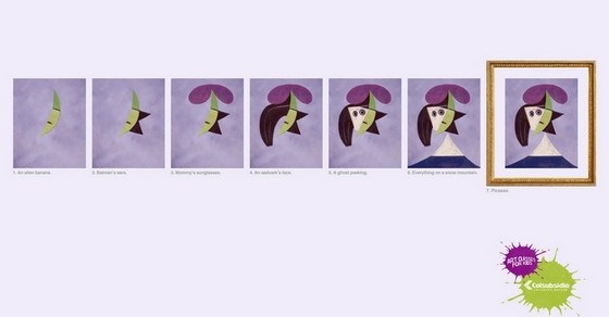 Как утверждают рекламные постеры, создание картин – дело нехитрое. Так, к примеру, полотно «Женщина в шляпе» кисти Пикассо раскладывается на ряд простых составляющих. Вначале нужно нарисовать причудливый зеленый банан, затем – уши Бэтмена, после – мамины солнцезащитные очки, далее на картине появляется призрак, и все это великолепие водружается на заснеженную вершину горы. Картина Кандинского тоже незамысловата: следует лишь совместить космические корабли и рыбий глаз, добавить несколько потерявшихся деталей из конструктора Lego, дополнить изображением ресниц старшей сестры, сыра Doritos и мексиканских усов. Картина Миро еще более причудливая: на морской глади постепенно появляются нос Губки Боба, два теннисных шарика, хот-дог с прикрепленной к нему телевизионной антенной, комариные лапы, и солнце цвета кетчупа.