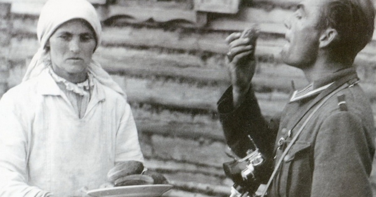 Немецкий репортер ест огурец, предложенный крестьянкой. Белоруссия, 1941 год.