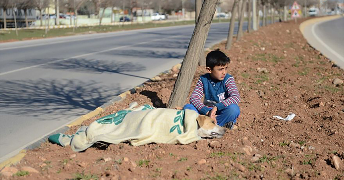 Недавно проходящий мимо фотограф стал свидетелем трогательной сцены — прямо на улице возле проезжей части сидел мальчик рядом с накрытой пледом собакой. Оказалось, что этот мальчик — беженец из Сирии. Вместе с семьей они жили в стоящем неподалеку наспех построенном доме, в которые поселили беженцев. А собаку сбил автомобиль.