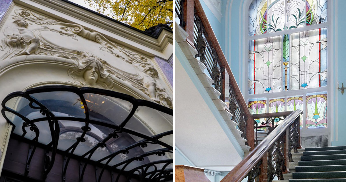 С архитектурной точки зрения этот особняк уникален: в отличие от других зданий, построенных в стиле модерн, он симметричен. Главный вход идет через центральный ризалит, на арке портала входной двери изображена голова девушки-Лорелеи. Аналогичные украшения можно увидеть и над окнами боковых ризалитов. Облицовка фасада имеет розовый цвет, на глазурованной плитке оригинально сморятся лепные панно, изображающие младенцев путто – популярный архитектурный элемент эпохи Ренессанса.