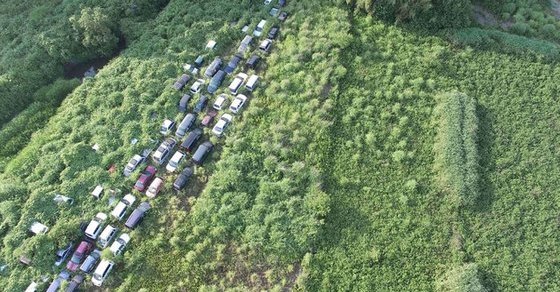 Это аэрофото, сделанное с дрона, показывает место хранения тысяч мешков, в которых находится загрязненная почва.