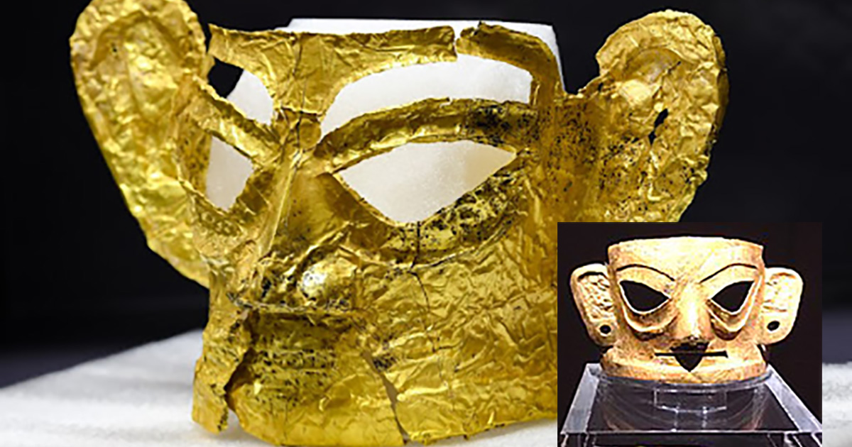 Золотая маска, найденная на месте руин Саньсиндуй. / Фото: edition.cnn.com