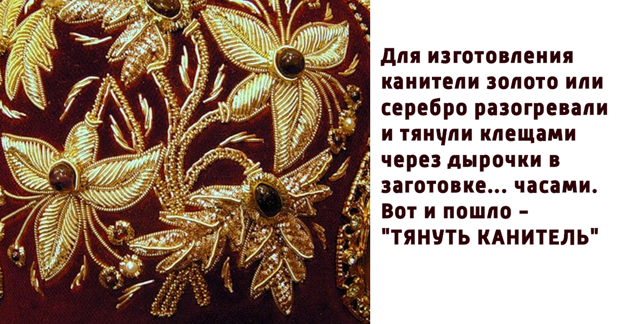 Когда предстоит какая-то монотонная, нудная работа, говорят, что придется «тянуть канитель». Сегодня мало кто задумывается над тем, что же имеется в виду на самом деле. Это выражение стало настолько привычным, что применяется бессознательно. А на самом деле канителью в древности называлась тонкая металлическая нить, иногда из серебра или золота, которой расшивались ковры или одежда.