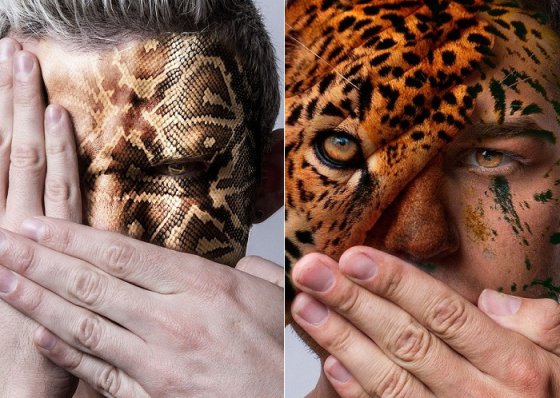 Сначала автор сфотографировал хищников, рептилий и птиц. А затем при помощи программы Photoshop «нарисовал» на лицах моделей «цифровой» макияж, имитирующий боди–арт. Результат получился очень оригинальным и правдоподобным.