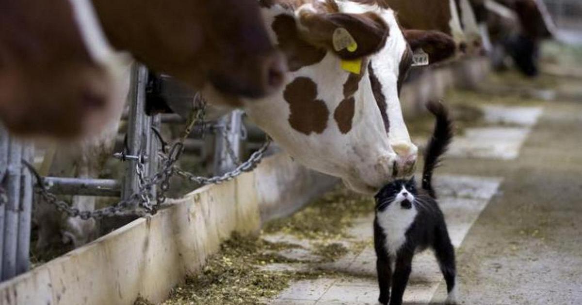 7. Необычные взаимоотношения завязались между кошкой и коровами на одной из молочных ферм